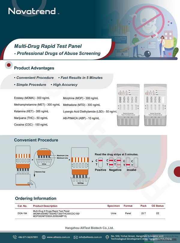 – Mã sản phẩm: Multi-Drug 9 Drugs Rapid Test Panel (Urine) (MDMA300/MET300/KET300/THC50/COC150/MOP300/MTD300/LSD50/ABP10)